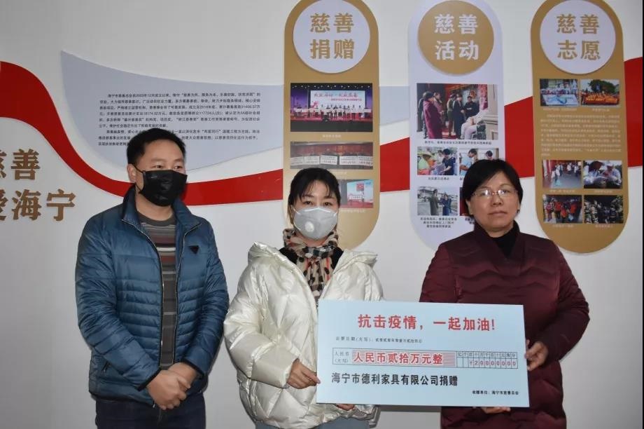 1月29日下午,海寧市德利家具有限公司向海寧市慈善總會捐贈20萬元,其中10萬元定向捐贈給周王廟鎮人民政府,用于疫情防控所需。